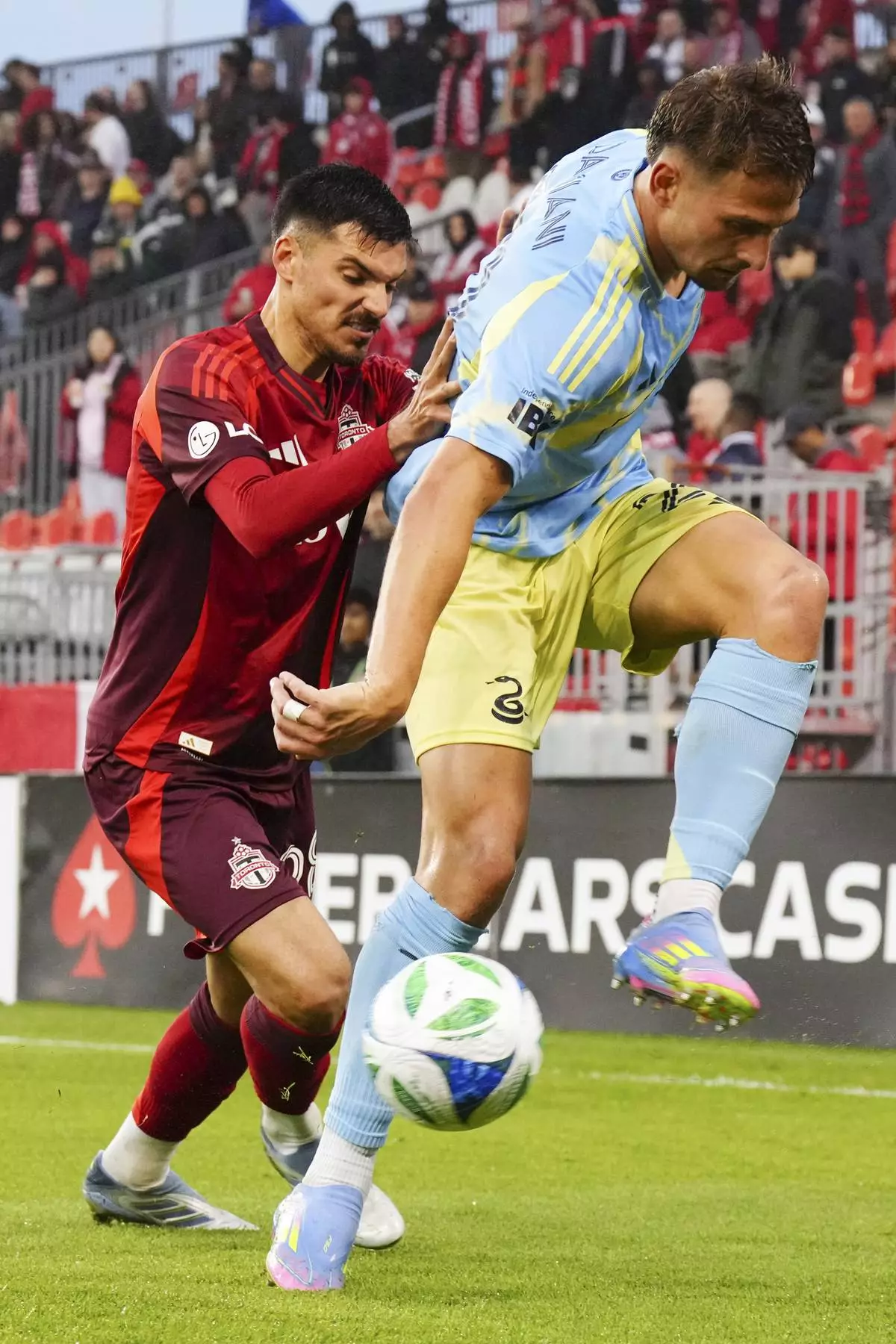 Philadelphia Union's Bruno Damiani (right) battles for the ball with Toronto FC's Raoul Petretta (28) during first half MLS action in Toronto, on Wednesday, May 28, 2025. (Chris Young/The Canadian Press via AP)