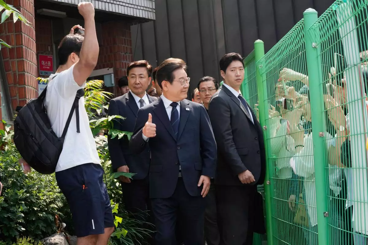 South Korean Democratic Party's presidential candidate Lee Jae-myung, center, reacts as he leaves after casting his early vote for the June 3 presidential election near a polling station in Seoul, South Korea, Thursday, May 29, 2025. (AP Photo/Ahn Young-joon)