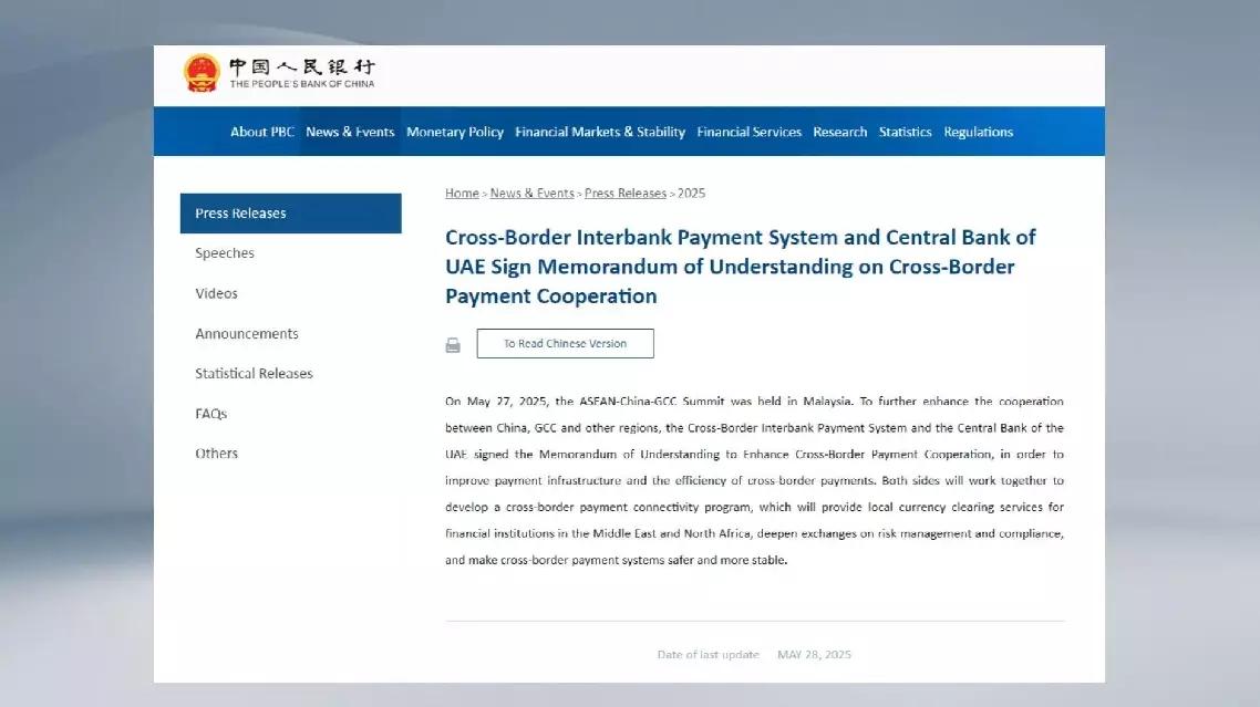 China's Cross-Border Interbank Payment System (CIPS) and the central bank of the United Arab Emirates (UAE) have signed a memorandum of understanding to enhance cross-border payment cooperation at the ASEAN-China-GCC Economic Forum 2025 in Kuala Lumpur, the capital of Malaysia, the People's Bank of China (PBOC), China's central bank, announced on Wednesday.
