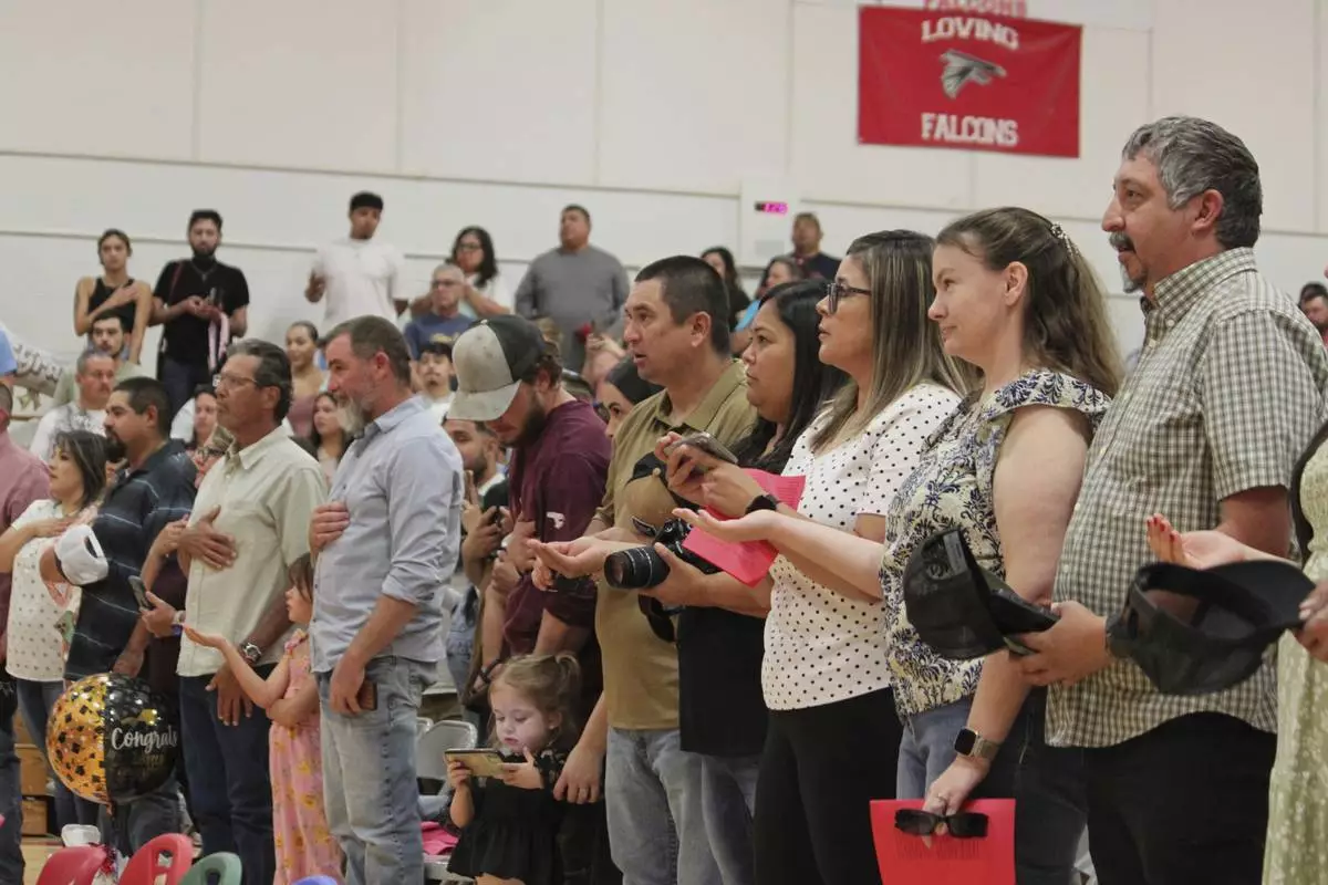 Family and friends recite the New Mexico state flag pledge ahead of a kindergartens' graduation ceremony at the elementary school in Loving, N.M., on Tuesday, May 20, 2025. (AP Photo/Susan Montoya Bryan)