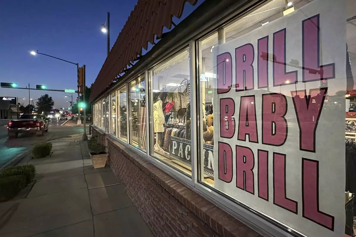 A sign in support of the oil and natural gas industry is displayed in a shop window along a main street in Carlsbad, N.M., on Tuesday, May 20, 2025. (AP Photo/Susan Montoya Bryan)