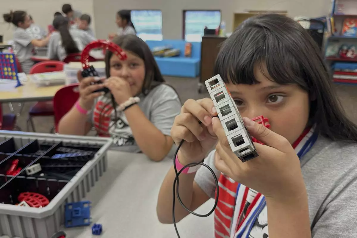 Loving Elementary School students participate in a science, technology, engineering and math lab supported by The Ripken Foundation and Devon Energy, in Loving, N.M., on Monday, May 19, 2025. (AP Photo/Susan Montoya Bryan)