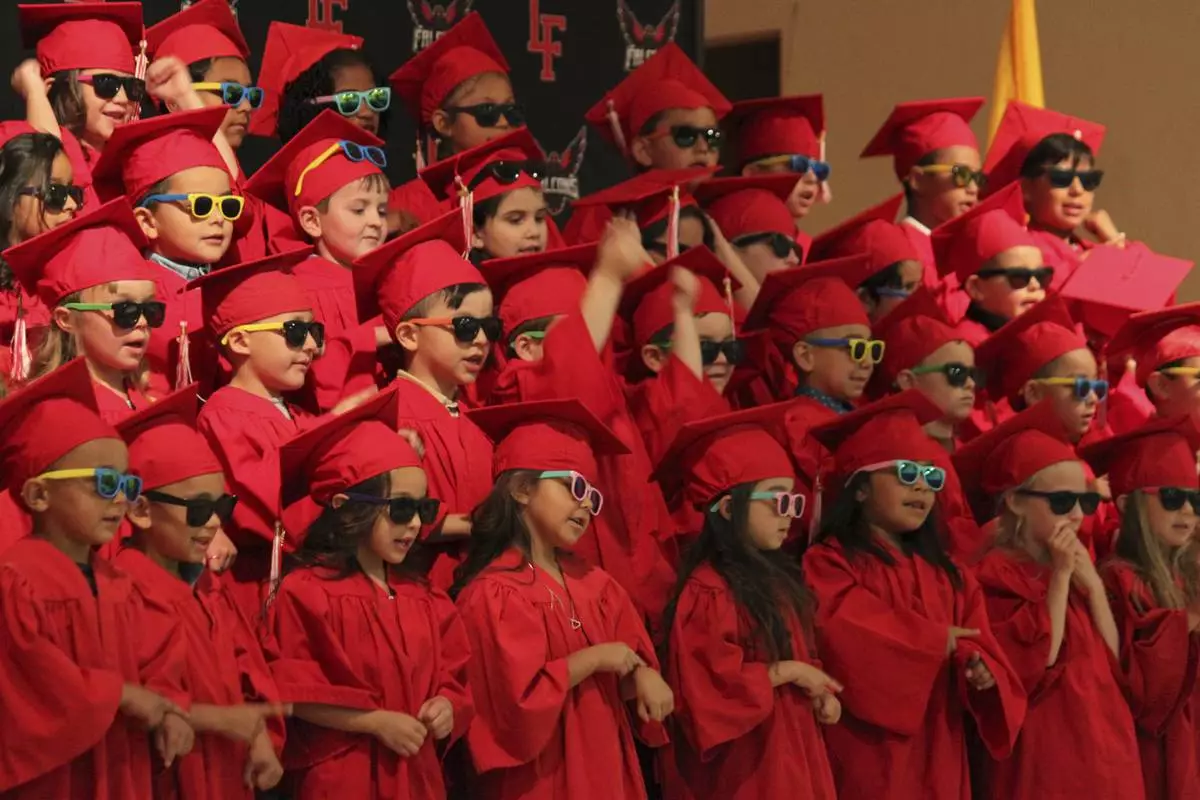 Kindergartners perform during their graduation during a ceremony at the Loving Elementary School in Loving, New Mexico, on Tuesday, May 20, 2025. (AP Photo/Susan Montoya Bryan)