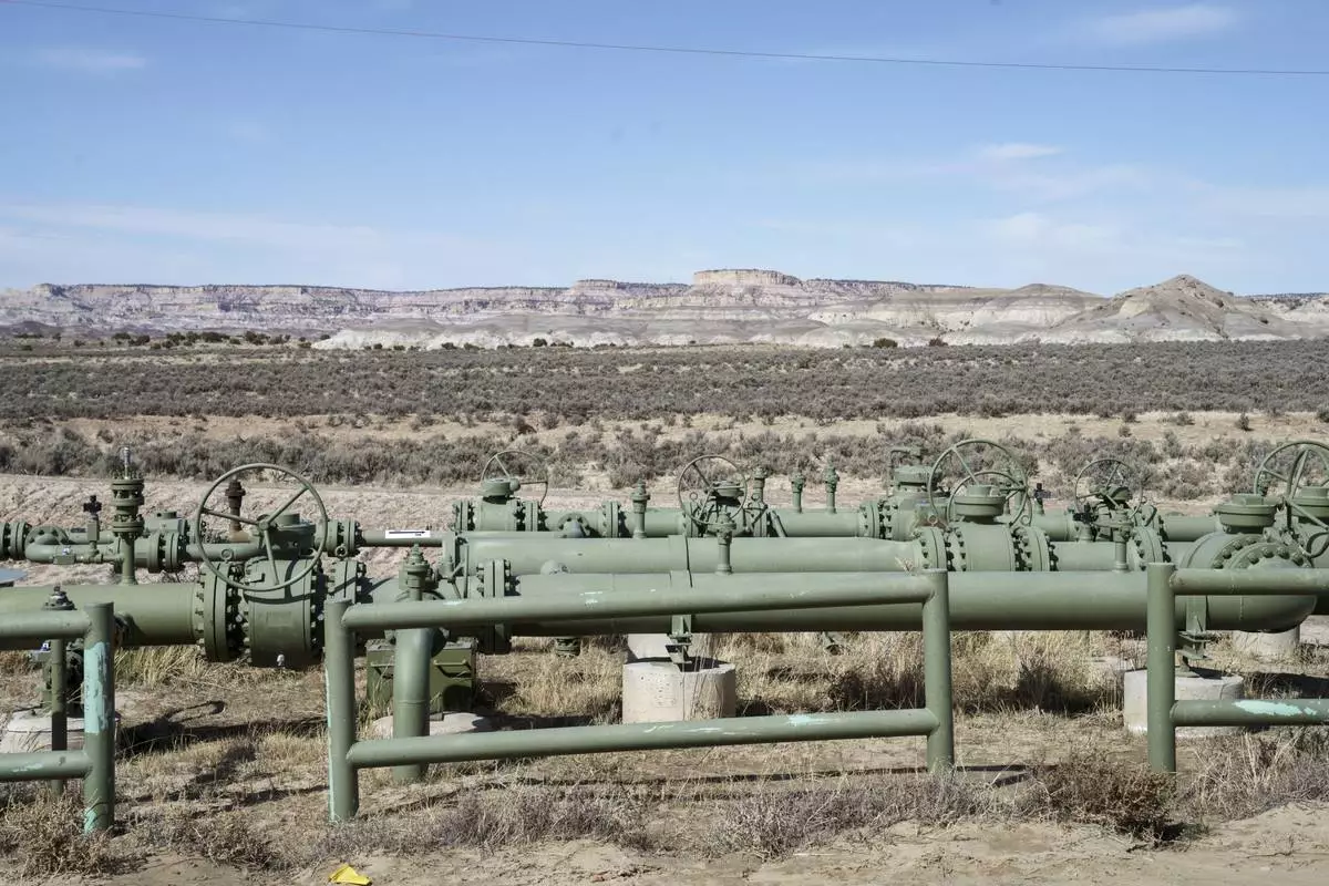 A view of natural gas pipes installed above ground in a field at a well pad in Counselor, N.M., Navajo Nation, on Tuesday March 11, 2025. (Nadav Soroker/Searchlight New Mexico via AP)