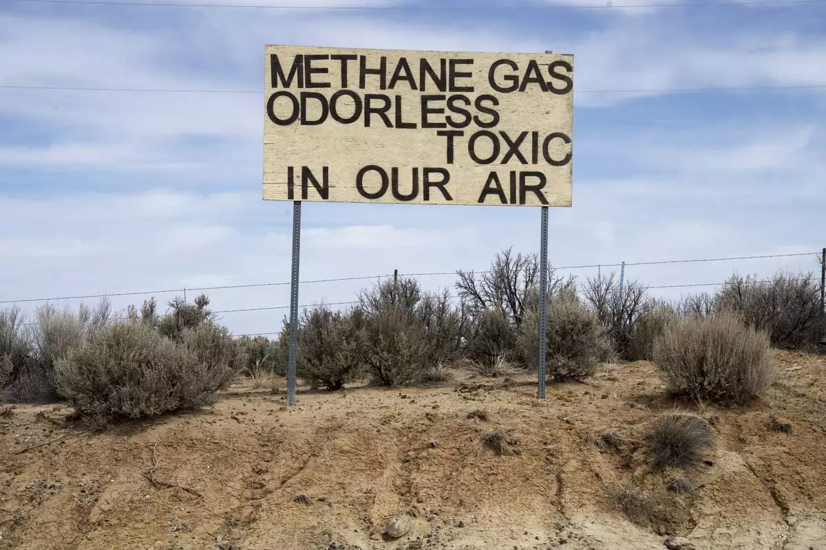 A sign protesting emissions from oil and gas stands across from Lybrook Elementary School, in Counselor, N.M., Navajo Nation, on Tuesday, March 11, 2025. (Nadav Soroker/Searchlight New Mexico via AP)