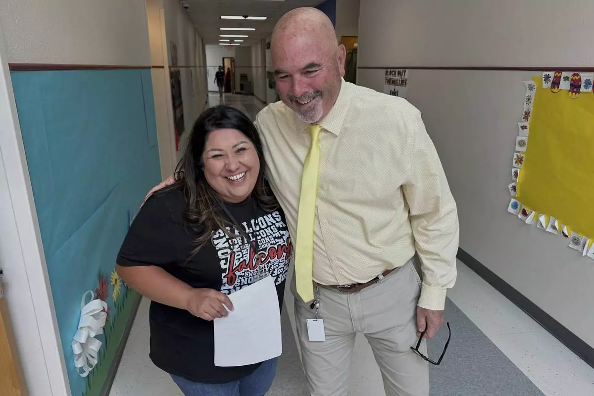 Superintendent Lee White shares a hug with teacher Vanessa Calderon in the hall of the elementary school in Loving, N.M., on Monday, May 19, 2025. (AP Photo/Susan Montoya Bryan)