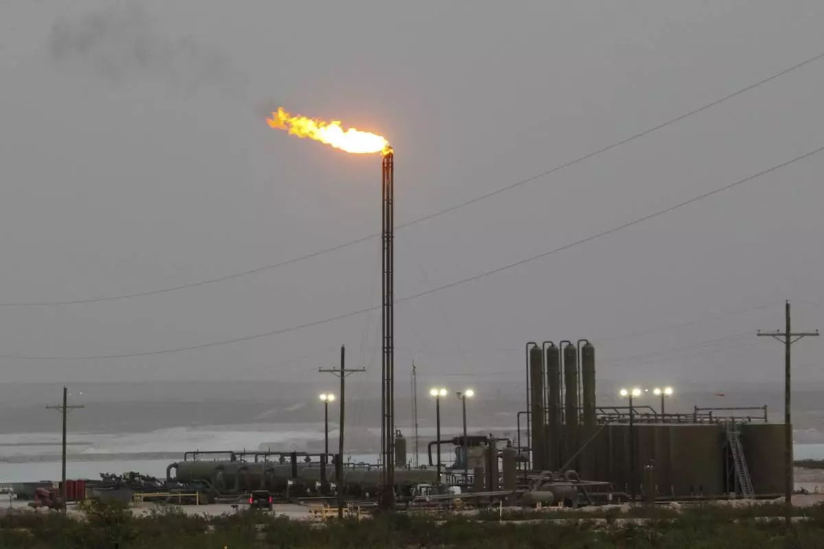 Strong winds kick up dust as a facility in the Permian Basin flares natural gas east of Carlsbad, N.M., on Monday, May 19, 2025. (AP Photo/Susan Montoya Bryan)