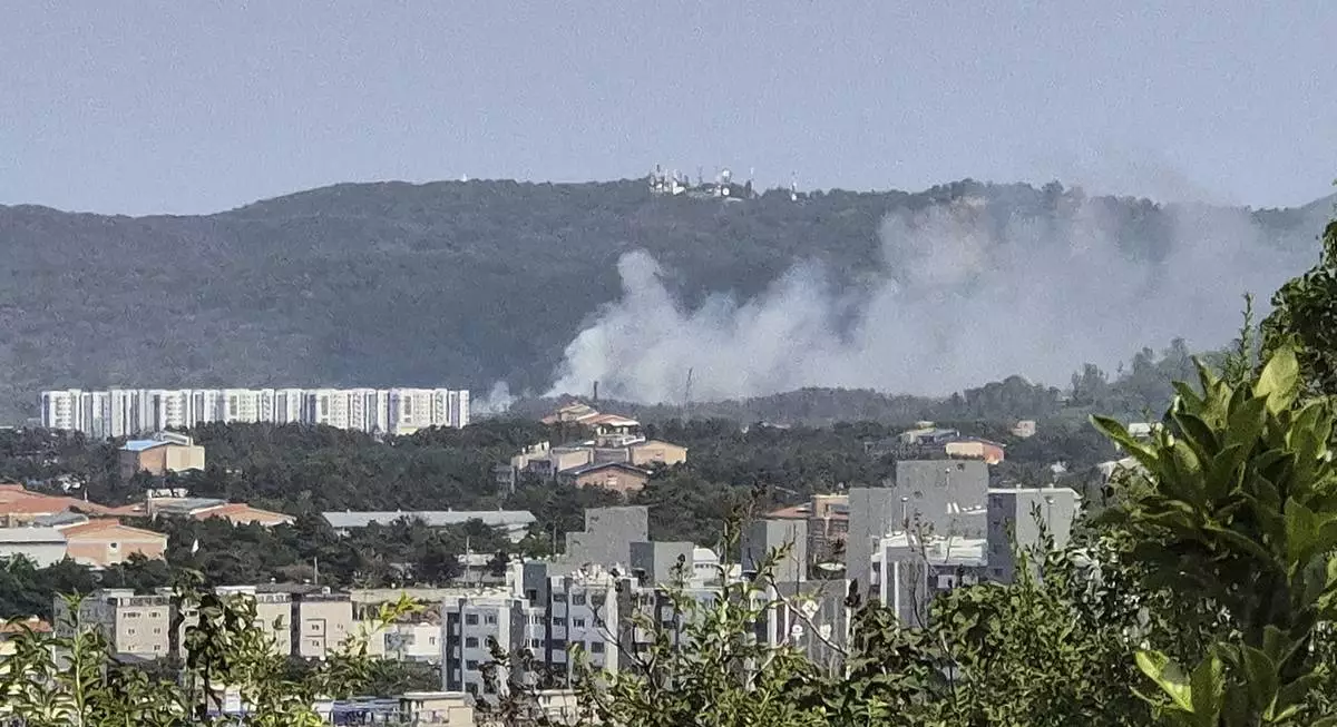 Smoke rises from a mountain in Pohang, South Korea, where a Navy patrol plane carrying four people crashed on Thursday, May 29, 2025. (Son Dae-seong/Yonhap via AP)