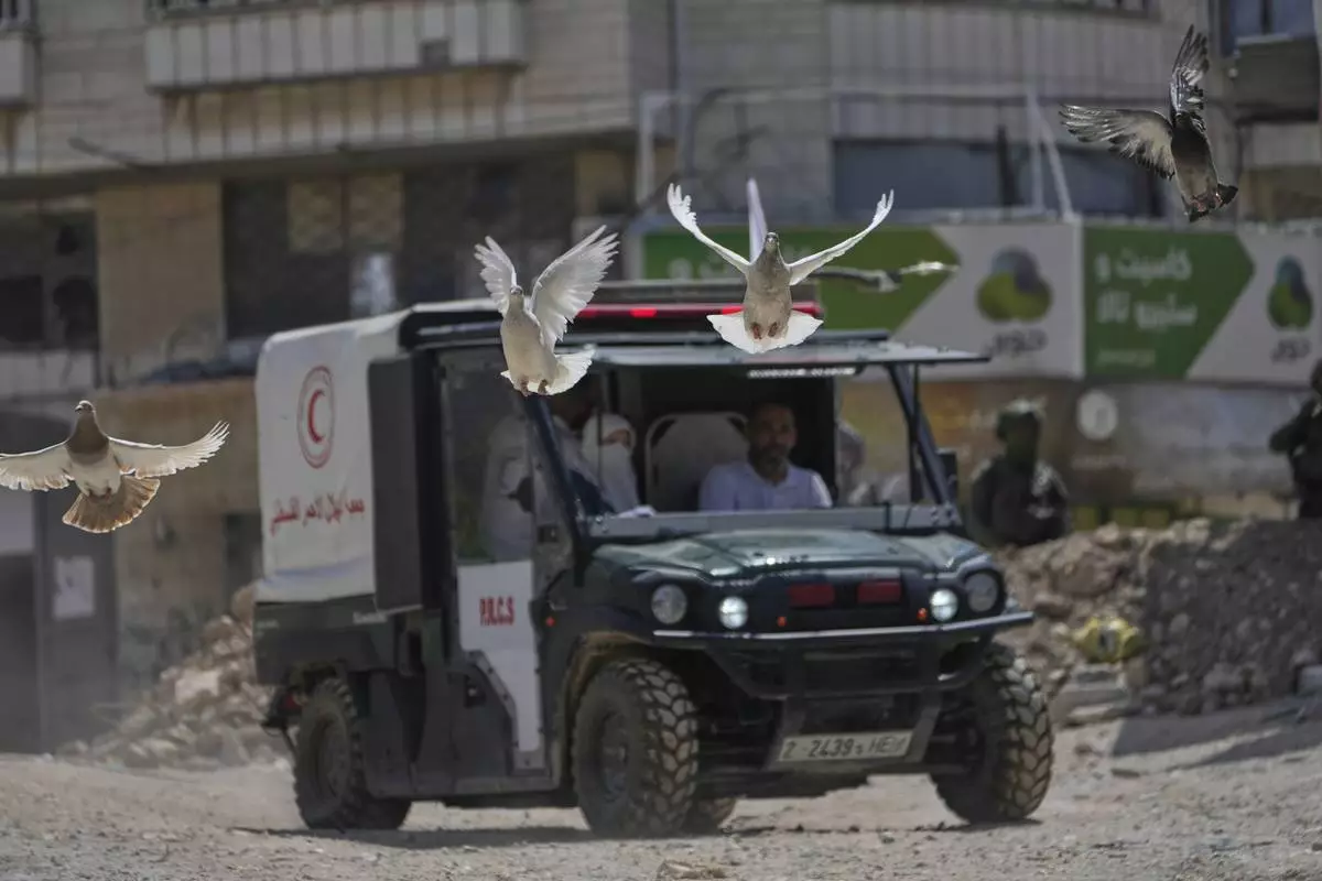 A Palestinian Red Crescent vehicle evacuates residents of the now evacuated refugee camp of Tulkarem who returned to collect belongings before the destruction of their homes as Israeli forces prepared to carry out the demolition of homes across the two refugee camps of the Israeli occupied West Bank city of Tulkarem, Thursday, May 29, 2025. (AP Photo/Nasser Nasser)