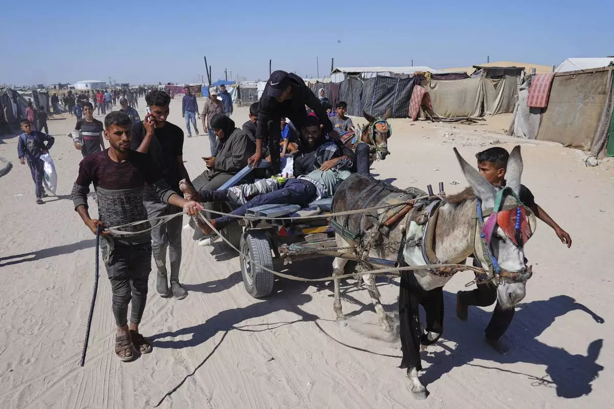 Palestinians carry an injured man after he was shot at an aid distribution center run by the Gaza Humanitarian Foundation a U.S.-backed organization approved by Israel in Khan Younis, southern Gaza Strip, on Thursday, May 29, 2025. (AP Photo/Abdel Kareem Hana)