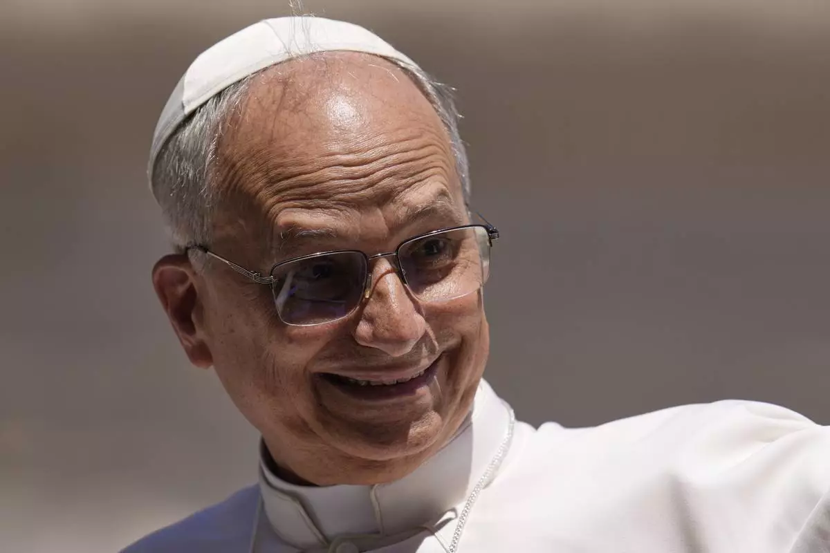 Pope Leo XIV smiles while leaving after his weekly general audience in St. Peter's Square at The Vatican, Wednesday, May 28, 2025. (AP Photo/Gregorio Borgia)
