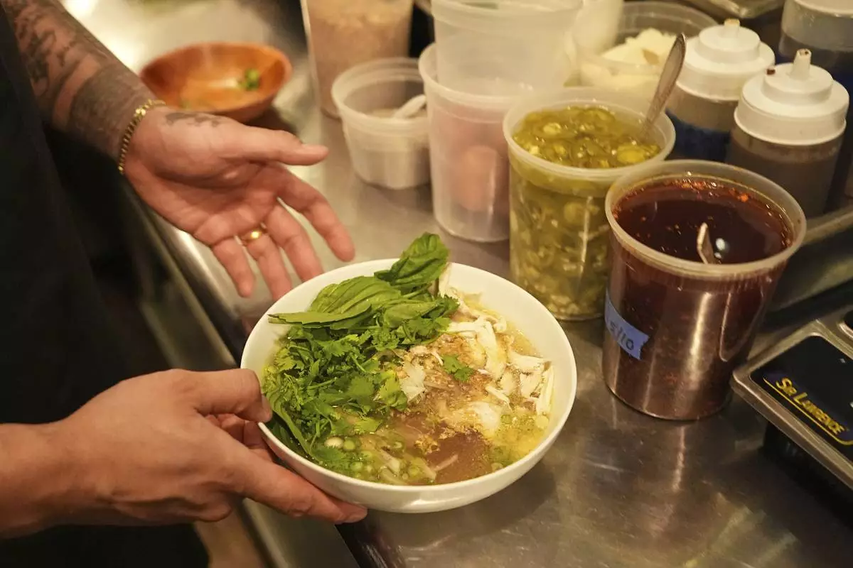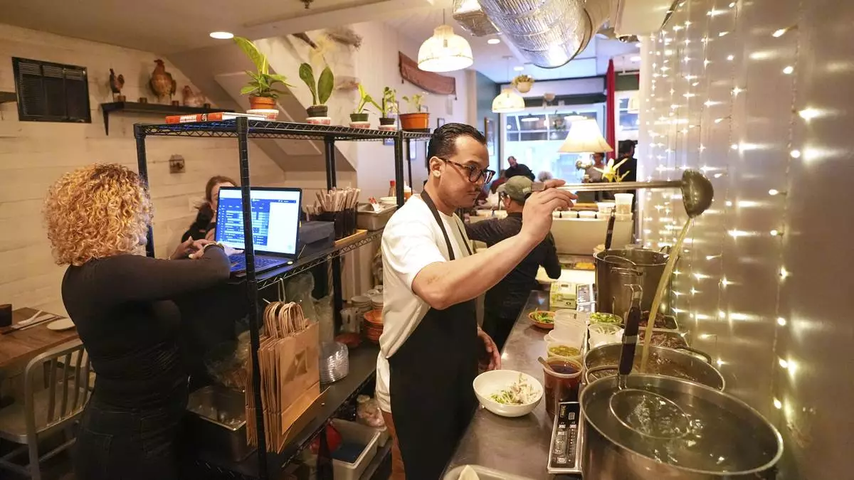 Chef Phila Lorn holds a bowl of the The Mawn Noodle soup at his restaurant, Mawn, in Philadelphia, Thursday, May 22, 2025. (AP Photo/Matt Rourke)