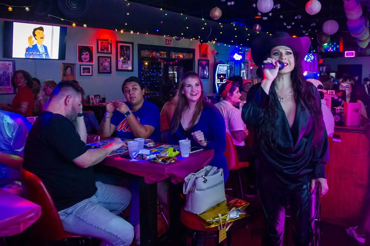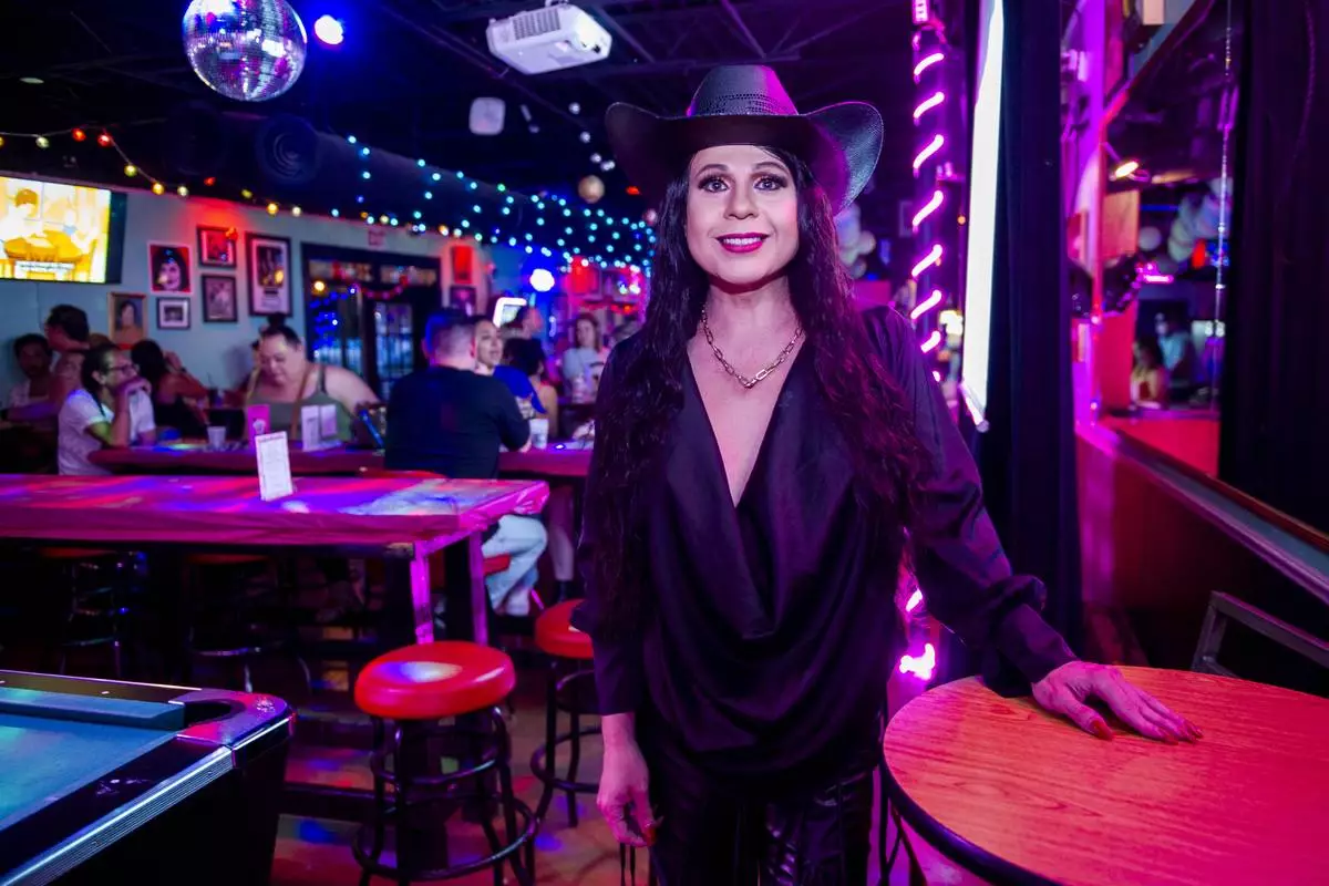 Audrey Campos poses for The Associated Press while hosting a Loteria game night at Jackie O's Cocktail Club in Fort Worth, Texas, Tuesday, May 27, 2025. (AP Photo/Ronaldo Bolaños)
