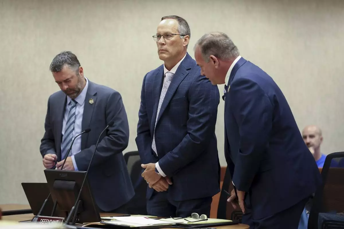 Former Michigan State Police trooper Brian Keely, center, appears in court with his lawyers for his preliminary hearing at the Kentwood District Court, in Kentwood, Mich., August 12, 2024. (Neil Blake/The Grand Rapids Press via AP)
