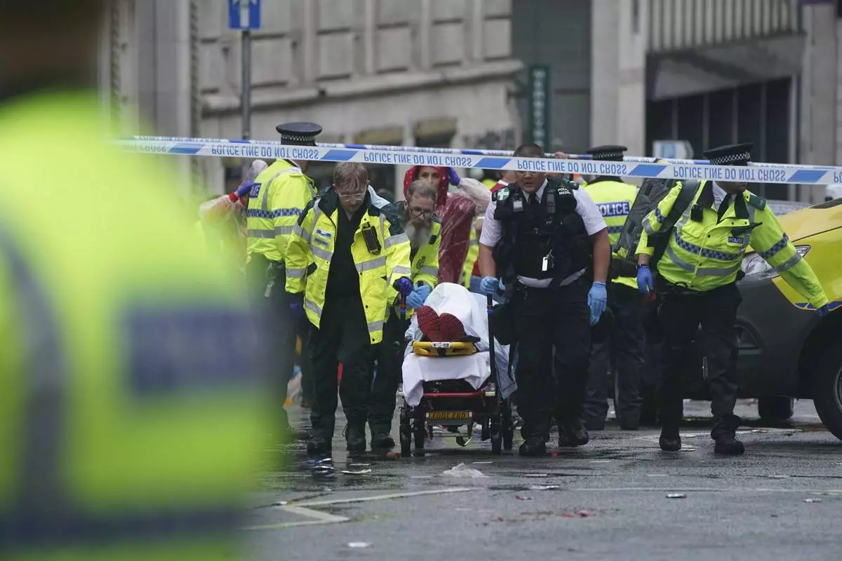 Police and emergency personnel deal with an incident near the Liver Building during the Premier League winners parade, in Liverpool, England, Monday May 26, 2025. (Owen Humphreys/PA via AP)