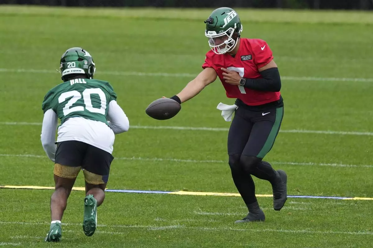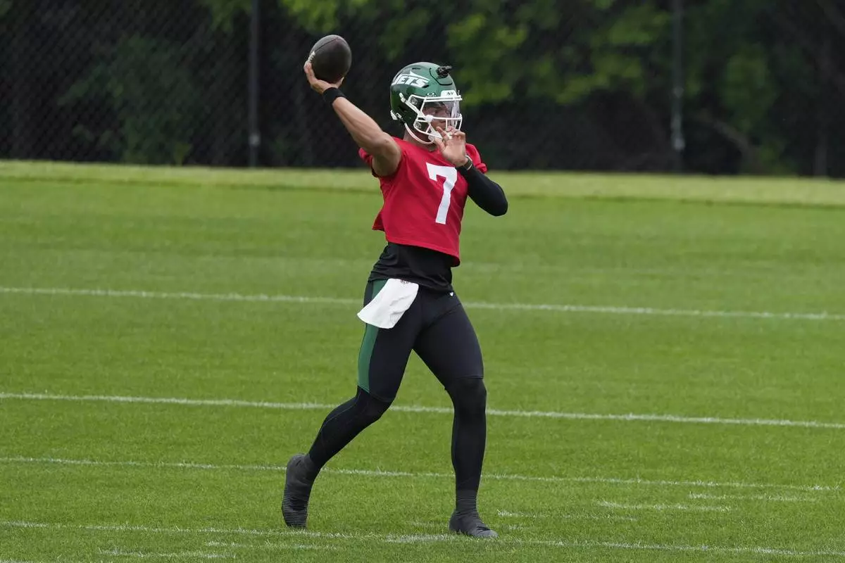 New York Jets quarterback Justin Fields (7) participates during an NFL football practice in Florham Park, N.J., Thursday, May 29, 2025. (AP Photo/Seth Wenig)