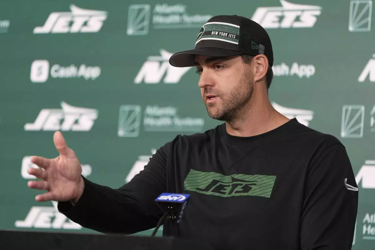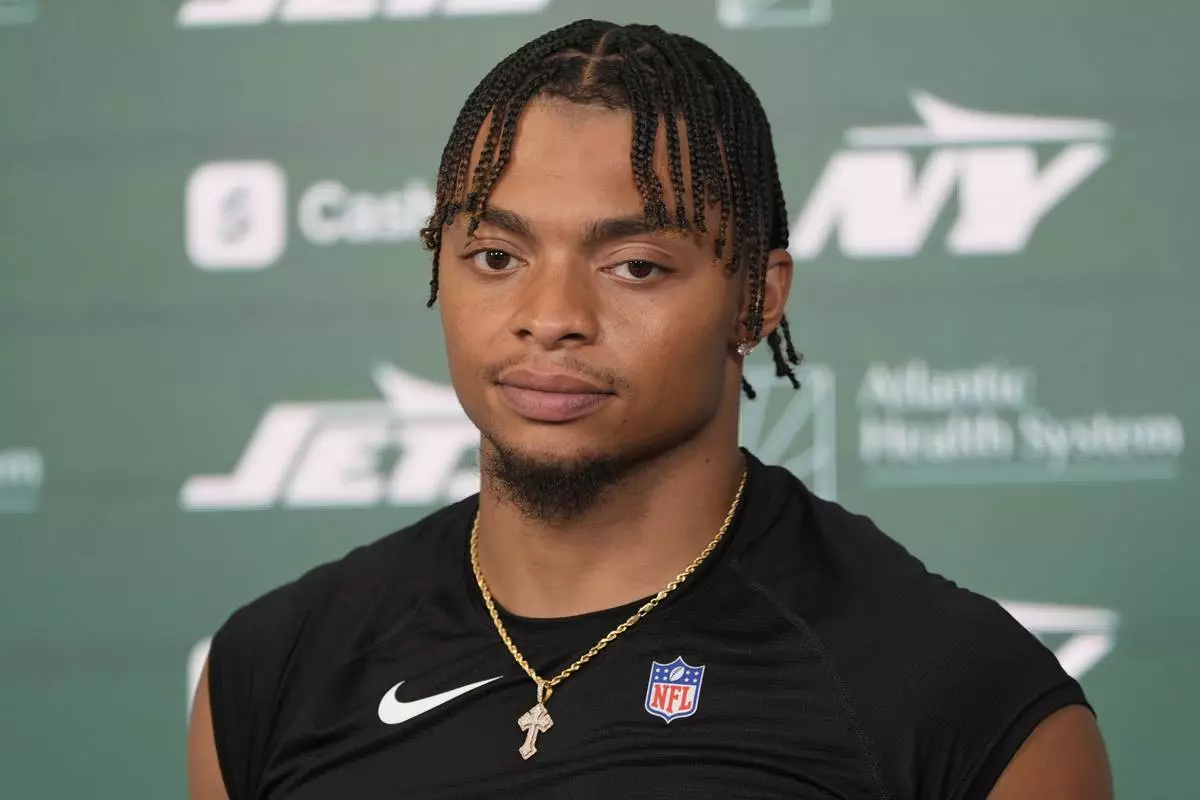 New York Jets quarterback Justin Fields talks to reporters after NFL football practice in Florham Park, N.J., Thursday, May 29, 2025. (AP Photo/Seth Wenig)