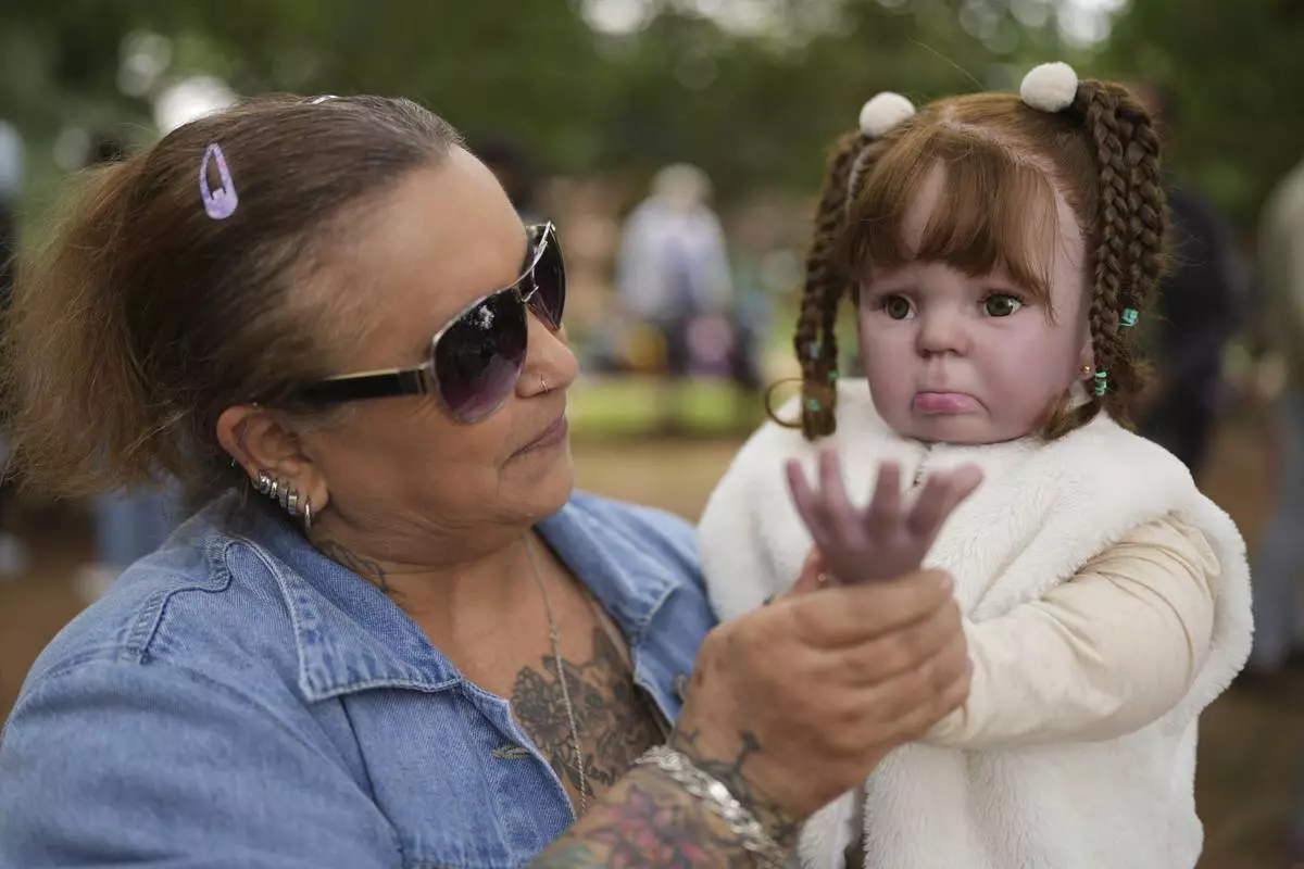 Nice Maria Santos holds her doll during a group gathering to bond and show off their hyper-realistic reborn baby dolls, in a park in Sao Paulo, Saturday, May 24, 2025. (AP Photo/Andre Penner)