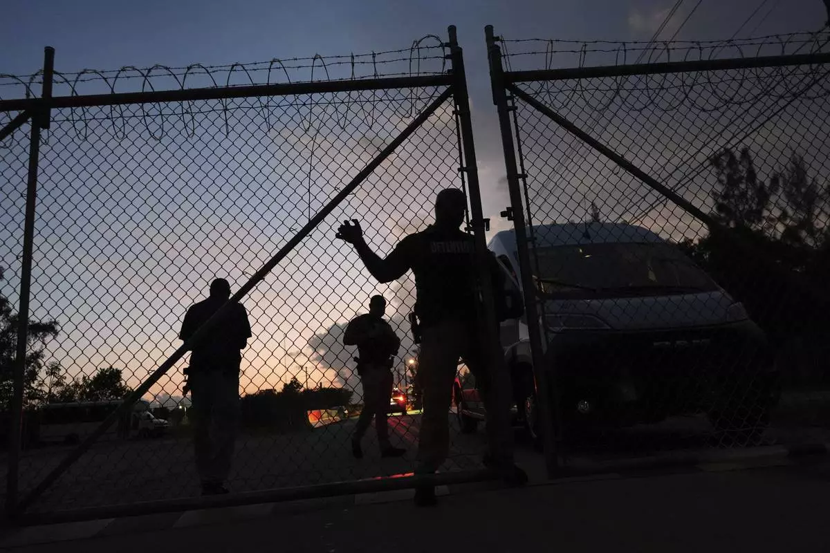 Krome Detention Center officers man an entrance gate as people hold a vigil outside to recognize those who have died in U.S. Immigration and Customs Enforcement custody, as well as those affected by mass deportations, Saturday, May 24, 2025, in Miami. (AP Photo/Rebecca Blackwell)