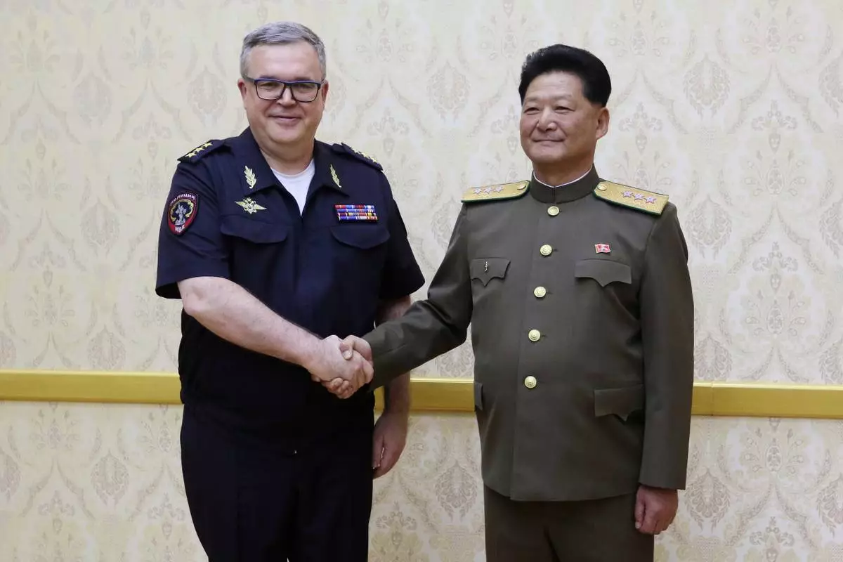 North Korean Public Security Minister Pang Tu Sop, right, meets with Russian Vice Interior Minister Vitaly Shulika at the Mansudae Assembly Hall in Pyongyang, North Korea Wednesday, May 28, 2025. (AP Photo/Jon Chol Jin)