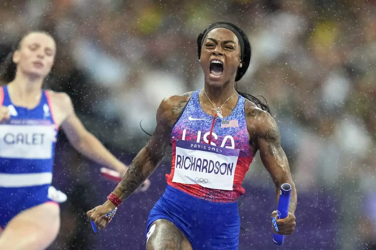FILE - Sha'carri Richardson, of the United States, crosses the finish line to win the gold medal in the women's 4 x 100 meters relay final at the 2024 Summer Olympics, on Aug. 9, 2024, in Saint-Denis, France. (AP Photo/Ashley Landis, File)