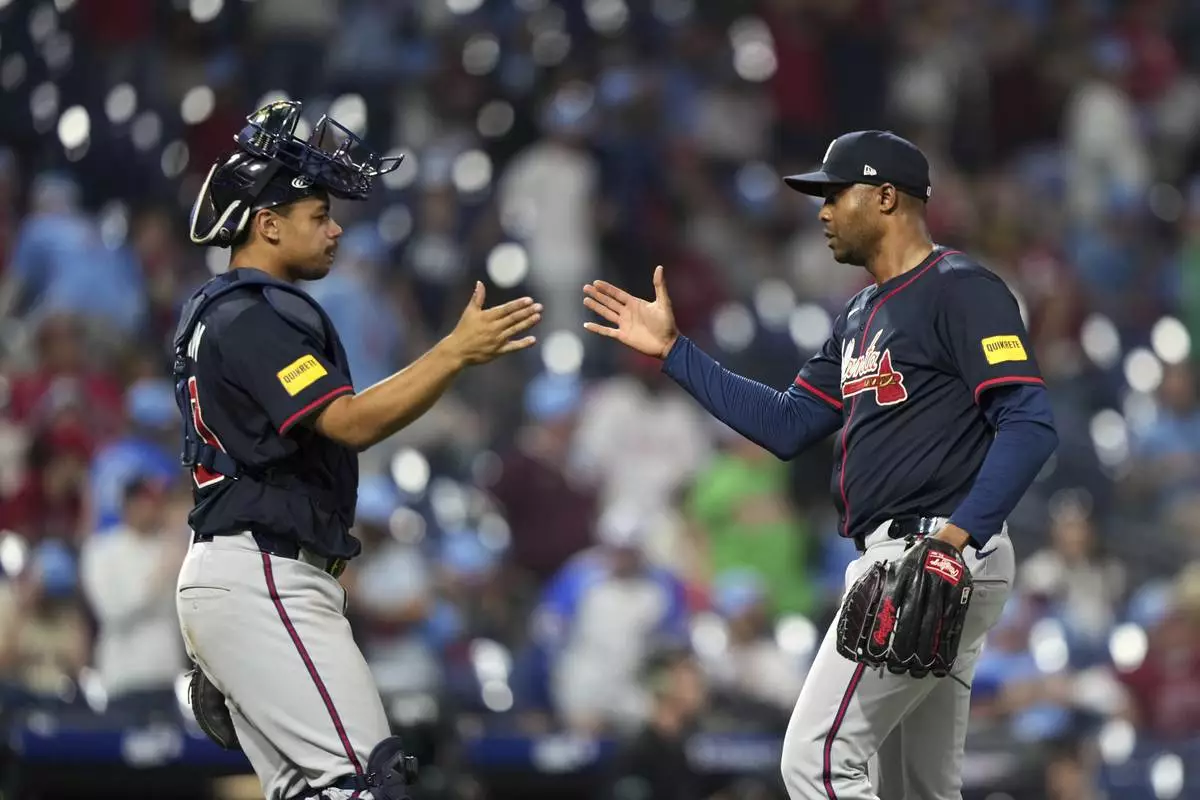 Atlanta Braves' Drake Baldwin, left, and Raisel Iglesias celebrate after the Braves won the second baseball game of a doubleheader against the Philadelphia Phillies Thursday, May 29, 2025, in Philadelphia. (AP Photo/Matt Slocum)