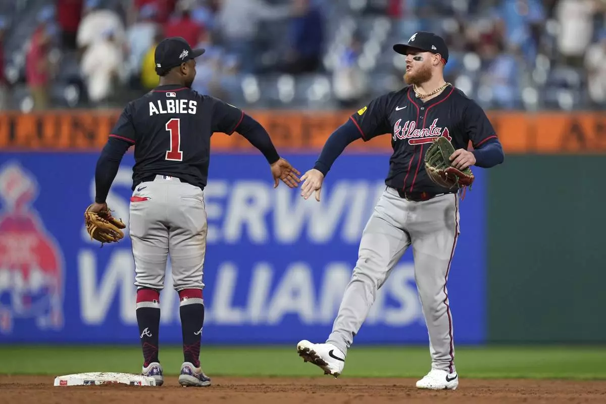 Atlanta Braves' Alex Verdugo, right, and Ozzie Albies celebrate after the Braves won the second baseball game of a doubleheader against the Philadelphia Phillies Thursday, May 29, 2025, in Philadelphia. (AP Photo/Matt Slocum)