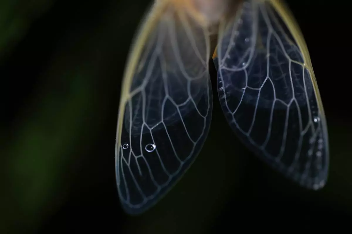 The veins of an adult periodical cicada's translucent wings are illuminated shortly after shedding its nymphal skin after a heavy rain, Friday, May 16, 2025, in Cincinnati. (AP Photo/Carolyn Kaster)