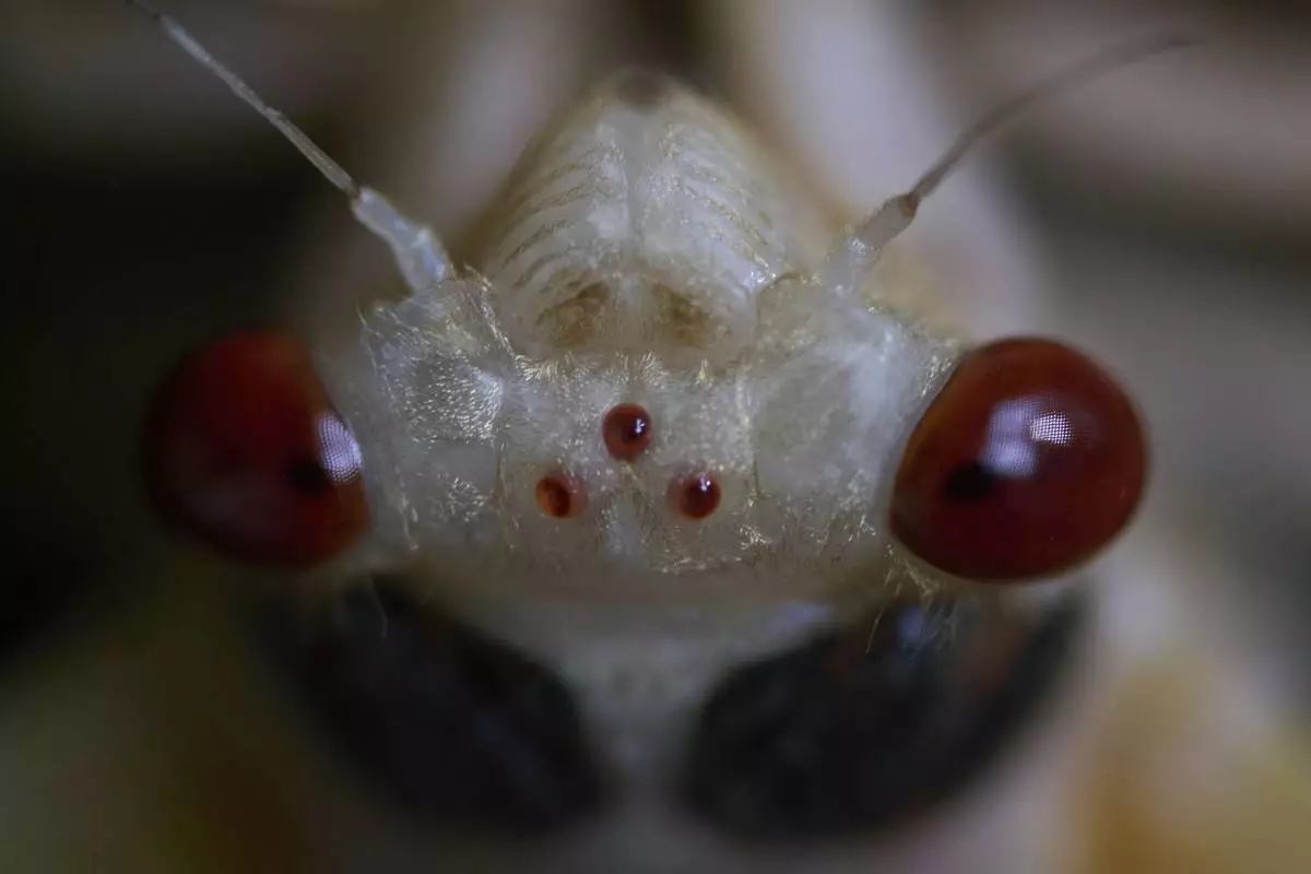 An adult periodical cicada, in the process of shedding its nymphal skin, is seen on Tuesday, May 20, 2025, in Cincinnati. There are two large compound eyes, which are used to visually perceive the world around them, and three small, jewel-like, simple eyes called ocelli center. (AP Photo/Carolyn Kaster)