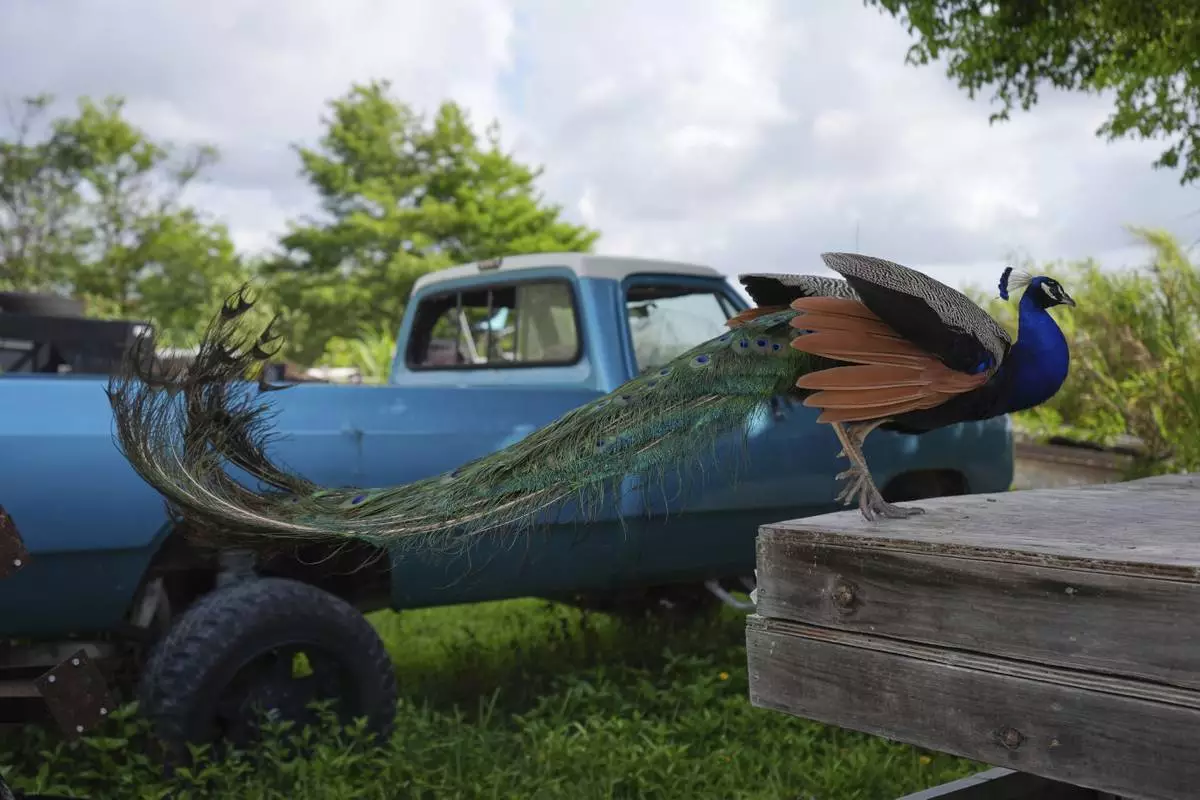 A peacock alights next to a pickup truck at Mack's Fish Camp, a family-owned airboat tour business and campground on the Eastern edge of the Everglades, Wednesday, May 28, 2025, near Miramar, Fla. (AP Photo/Rebecca Blackwell)