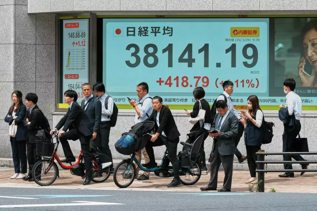 People stand in front of an electronic stock board showing Japan's Nikkei index at a securities firm Thursday, May 29, 2025, in Tokyo. (AP Photo/Eugene Hoshiko)