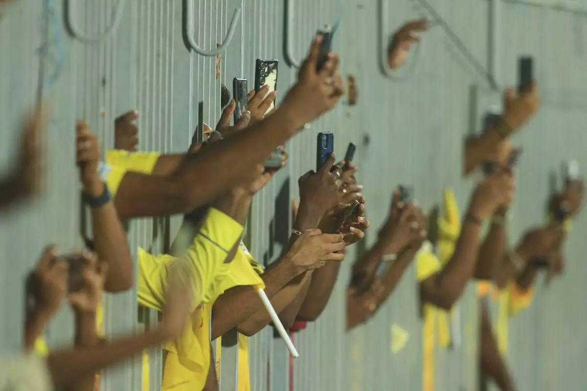 Fans stand behind a fence and use their mobile phones to take pictures of players before the start of an Indian Premier League cricket match in Chennai, India, Friday, April 25, 2025. (AP Photo/R. Parthibhan)