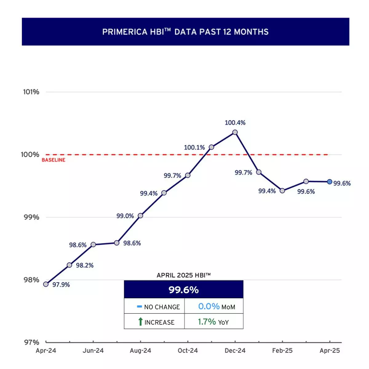 The latest Primerica Household Budget Index™ (HBI™) data, a monthly economic metric that examines how inflation and wage trends impact the ability of middle-income families to afford life’s everyday necessities, was 99.6% in April, unchanged from a month ago and up 1.7% from a year ago. Purchasing power held steady as the average earned income of middle-income households rose enough to offset the increase in the cost of necessity goods in April.