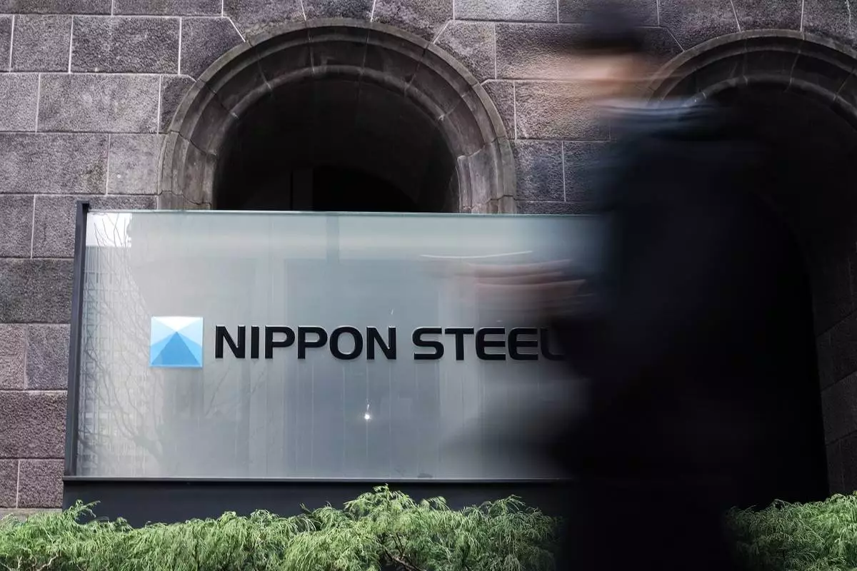 FILE - A person walks past a Nippon Steel Corporation sign at the company headquarters on Jan. 7, 2025, in Tokyo. (AP Photo/Eugene Hoshiko, File)