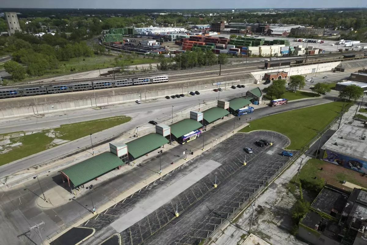 A Metra train, top, is seen in the tracks across from the Pace Harvey Transportation Center, Thursday, May 29, 2025, in Harvey, Ill. (AP Photo/Erin Hooley)