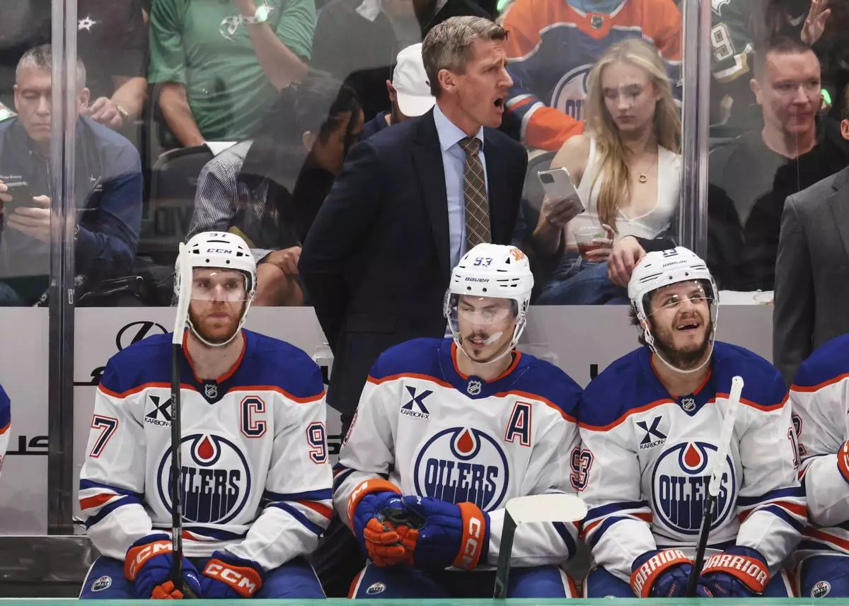 Edmonton Oilers head coach Kris Knoblauch yells from the bench during the first period of Game 5 of the Western Conference finals in the NHL hockey Stanley Cup playoffs against the Dallas Stars, Thursday, May 29, 2025, in Dallas. (AP Photo/Gareth Patterson)
