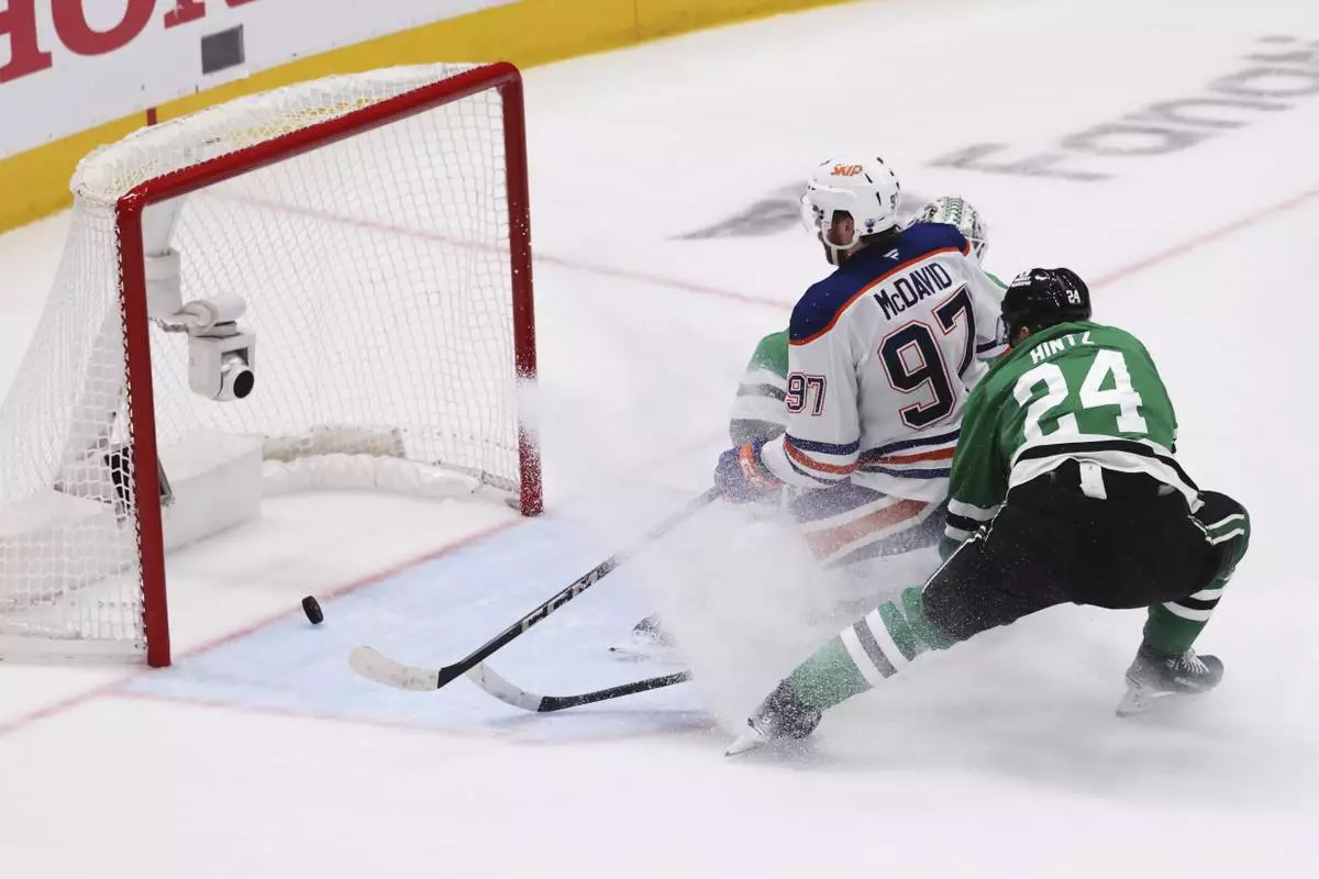 Edmonton Oilers center Connor McDavid (97) scores against Dallas Stars goaltender Casey DeSmith and center Roope Hintz (24) during the second period of Game 5 of the Western Conference finals in the NHL hockey Stanley Cup playoffs, Thursday, May 29, 2025, in Dallas. (AP Photo/Gareth Patterson)