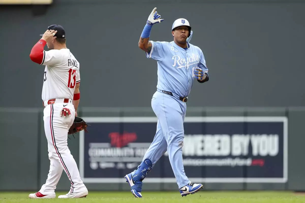 Kansas City Royals designated hitter Salvador Perez, right, celebrates his RBI single against the Minnesota Twins during the fifth inning of baseball game Saturday, May 24, 2025, in Minneapolis. (AP Photo/Matt Krohn)