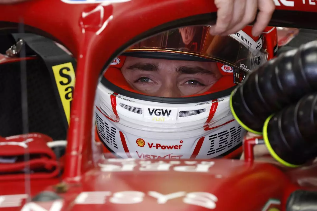 Ferrari driver Charles Leclerc of Monaco sits in his car during the second free practice ahead of the Spanish Grand Prix Formula One race at the Barcelona Catalunya racetrack in Montmelo, near Barcelona, Spain, Friday, May 30, 2025. (AP Photo/Joan Monfort)