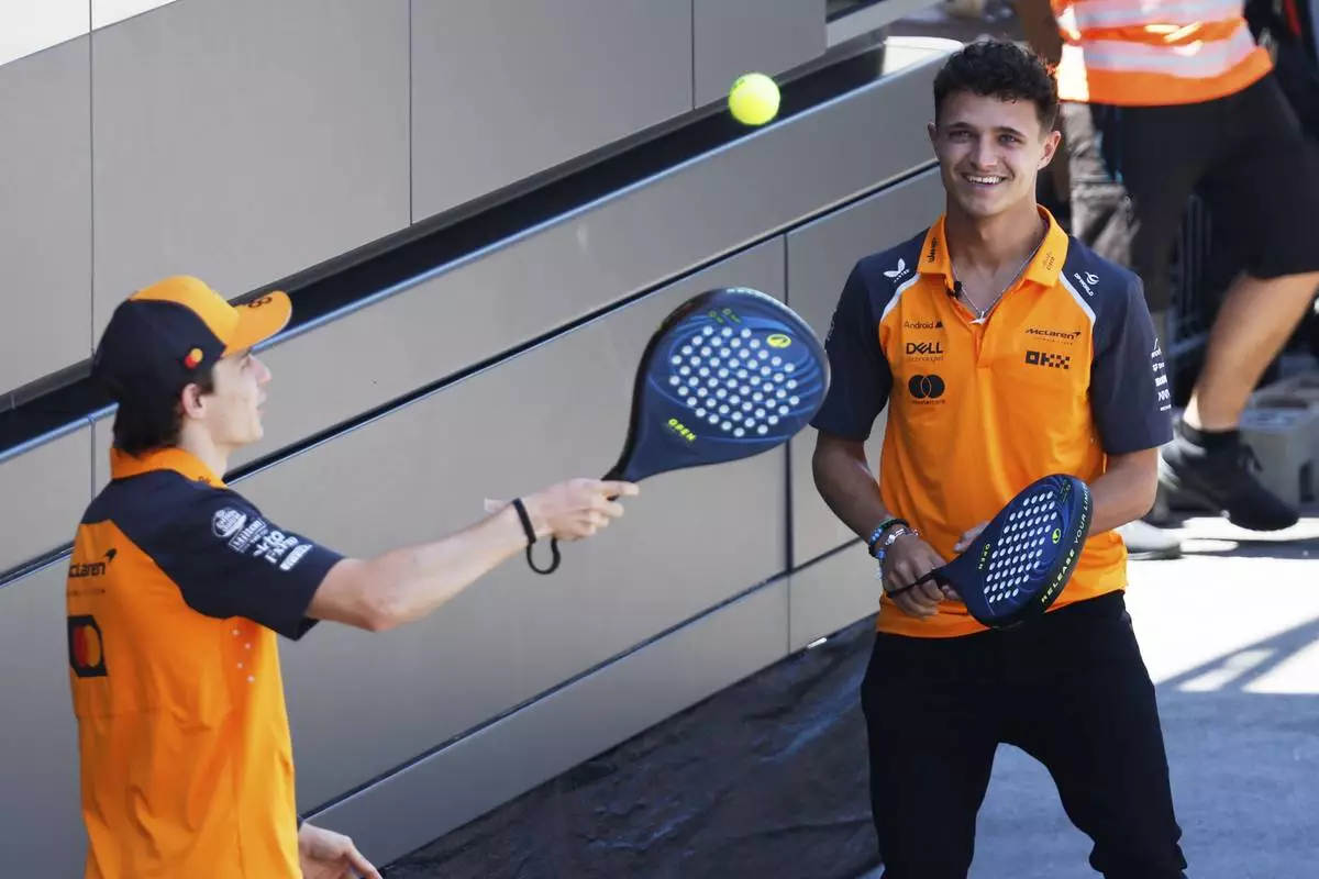 Oscar Piastri, of Australia, left, and Lando Norris, of United Kingdom, play padel at the Barcelona Catalunya racetrack in Montmelo, near Barcelona, Spain, Thursday May 29, 2025. The Spanish Grand Prix Formula One race will be held on Sunday. (AP Photo/Joan Monfort)