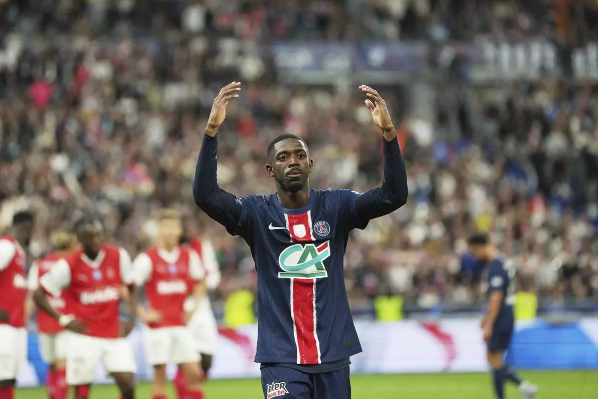 PSG's Ousmane Dembele celebrate at the end of the French Cup soccer final between Paris Saint-Germain and Reims at the Stade de France stadium in Saint-Denis, outside Paris, Saturday, May 24, 2025. (AP Photo/Aurelien Morissard)