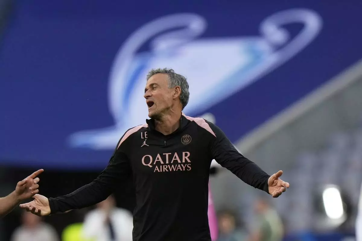 PSG's head coach Luis Enrique gestures during a training session ahead of the Champions League final soccer match between Paris Saint-Germain and Inter Milan in Munich, Germany, Friday, May 30, 2025. (AP Photo/Luca Bruno)