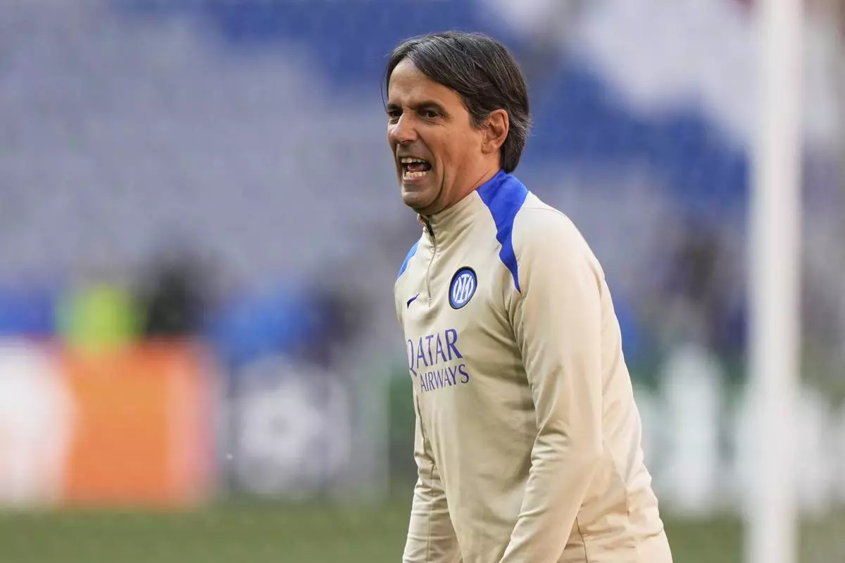 Inter Milan's head coach Simone Inzaghi shouts during a training session ahead of the Champions League final soccer match between Paris Saint-Germain and Inter Milan at the Allianz Arena in Munich, Germany, Friday, May 30, 2025. (AP Photo/Matthias Schrader)