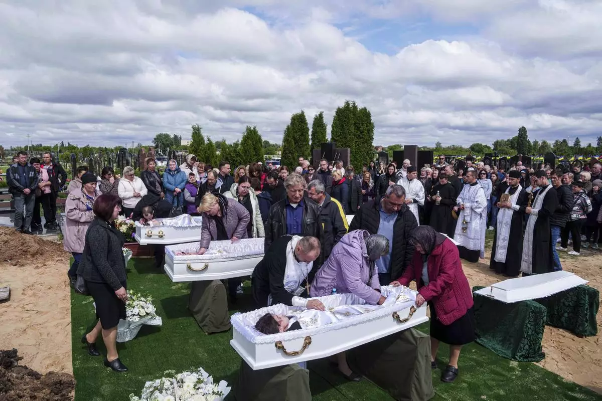 Relatives say goodbye to children Roman Martyniuk, 17, Tamara Martyniuk, 8, and Stanislav Martyniuk, 12, killed in a Russian strike on Sunday, during farewell ceremony in Korostyshiv, Zhytomyr region, Ukraine, Wednesday, May 28, 2025. (AP Photo/Evgeniy Maloletka)