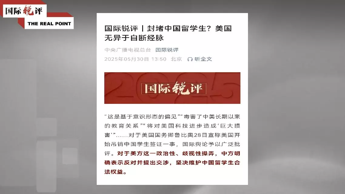 The visa-revoking targeting Chinese students exposes the soap bubble fabricated by the U.S., damages its credibility and image as a country holding a globally leading status in terms of education, and eventually leads to multiple losses of talent as well as economic and cultural influence.