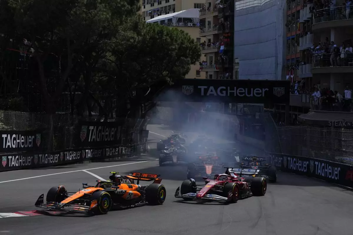 McLaren driver Lando Norris of Britain leads the field after the start during the Formula One Monaco Grand Prix race at the Monaco racetrack in Monaco, Sunday, May 25, 2025. (AP Photo/Manu Fernandez)