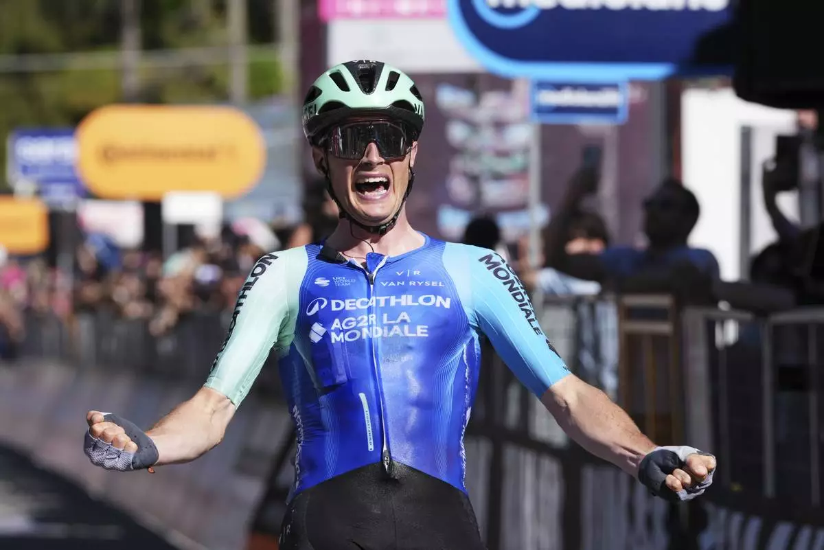 France's Nicolas Prodhomme of Decathlon Ag2R La Mondiale Team reacts after crossing the finish line to win the 19th stage of the Giro d'Italia cycling race, from Biella to Champoluc, Italy, Friday, May 30, 2025. (Gian Mattia D'Alberto/LaPresse via AP)