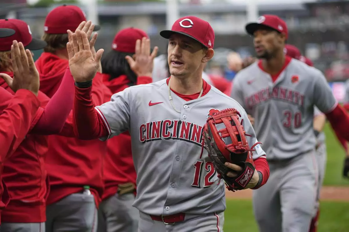 Cincinnati Reds' Austin Hays celebrates with teammates after their baseball game against the Kansas City Royals, Monday, May 26, 2025, in Kansas City, Mo. (AP Photo/Charlie Riedel)