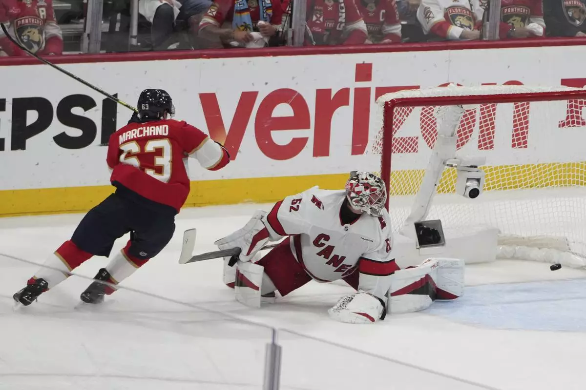 Florida Panthers' Brad Marchand (63) skates in front of Carolina Hurricanes goaltender Frederik Andersen (31) during the first period of Game 5 of the NHL hockey Stanley Cup Eastern Conference finals in Raleigh, N.C., Wednesday, May 28, 2025. (AP Photo/Karl DeBlaker)