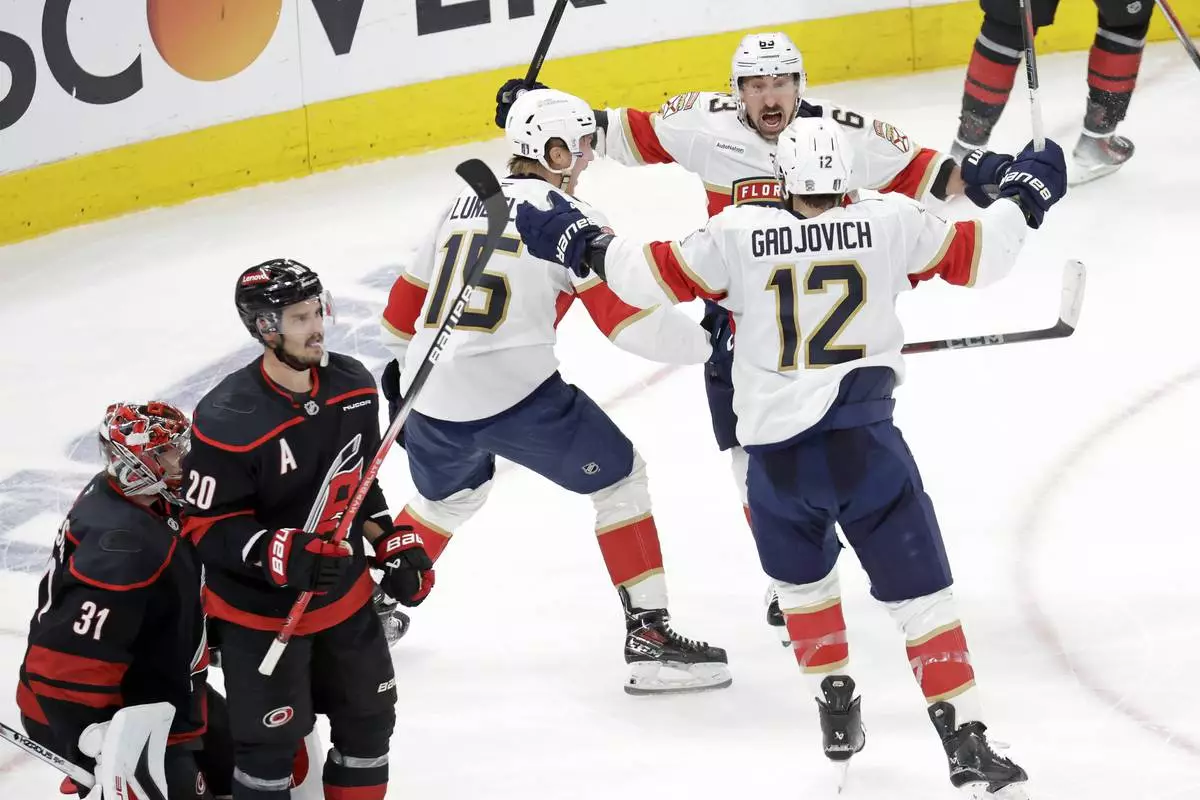 Florida Panthers center Anton Lundell (15) celebrates his goal with center Brad Marchand, top right, and left wing Jonah Gadjovich (12) while Carolina Hurricanes goaltender Frederik Andersen (31) and center Sebastian Aho (20) react during the second period in Game 5 of the NHL hockey Stanley Cup Eastern Conference finals Wednesday, May 28, 2025, in Raleigh, N.C. (AP Photo/Chris Seward)